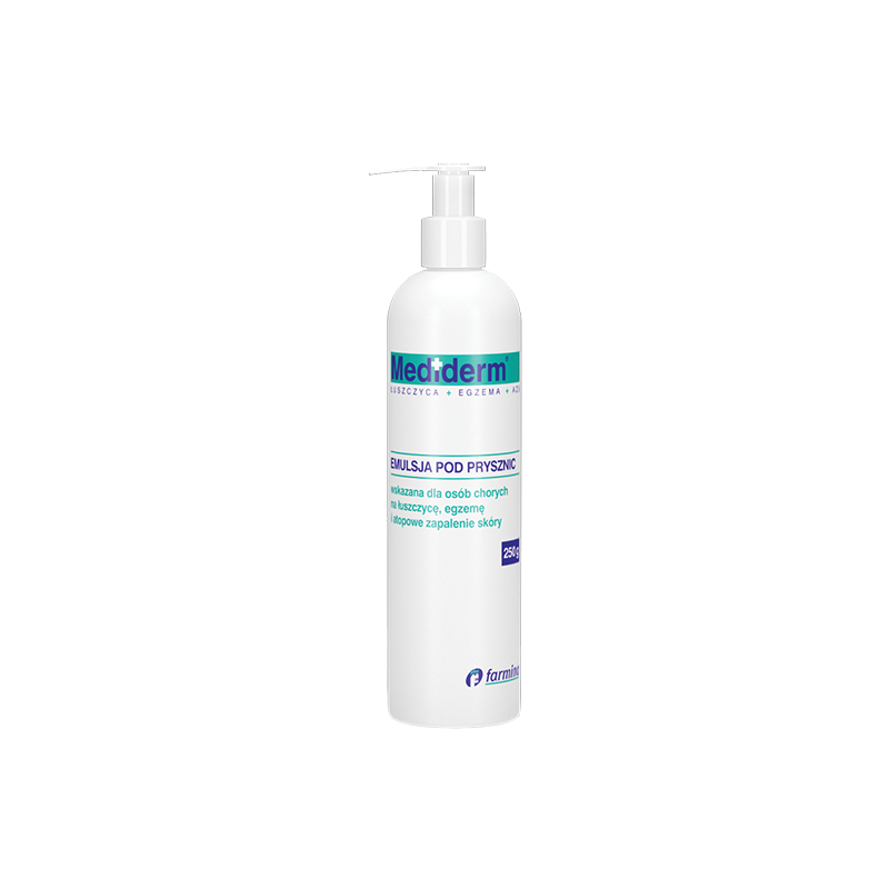 Mediderm shower jest nawilżającą, niepieniącą się emulsją myjącą stworzoną specjalnie do pielęgnacji chorobowo zmienionych skóry w przebiegu łuszczycy, egzemy i atopowego zapalenia skóry.