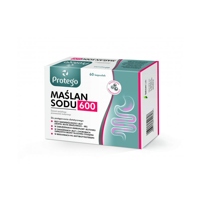 Protego Maślan Sodu 600 to żywność specjalnego przeznaczenia medycznego w postaci kapsułek zawierająca 600 mg maślanu sodu w tym 480 mg kwasu masłowego.