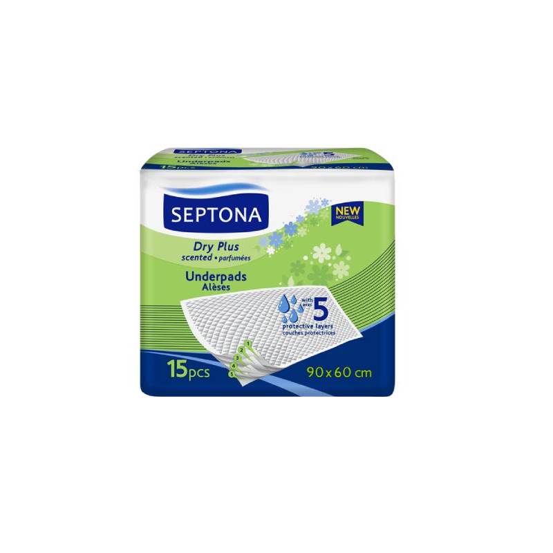 Podkłady higieniczne SEPTONA Dry Plus mają pięciowarstwową strukturę, która gwarantuje bardzo wysoką chłonność oraz skuteczną ochronę materaca lub fotela. Dolna warstwa jest wodoodporna i antypoślizgowa, dzięki czemu podkład nie przesuwa się i chroni powierzchnię przed zamoczeniem. Pikowana wierzchnia część szybko odprowadza płyny, pozostawiając skórę i podłoże suche. Technologia SAP (Super Absorbing Polymer) efektywnie zamyka wilgoć w środku, a subtelny, łagodny zapach pomaga neutralizować nieprzyjemne aromaty.