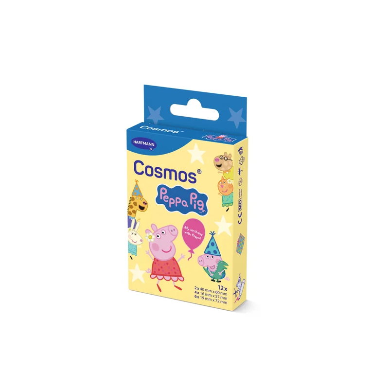 Hartmann Cosmos® Plaster Peppa Pig, 3 rozmiary, 12 sztuk to zestaw barwnych plastrów jednorazowych dla dzieci, ozdobionych motywami z popularnej bajki Świnka Peppa. W opakowaniu znajduje się 12 plastrów w trzech różnych wielkościach, dzięki czemu można je łatwo dopasować do małych skaleczeń czy otarć w różnych miejscach na ciele.