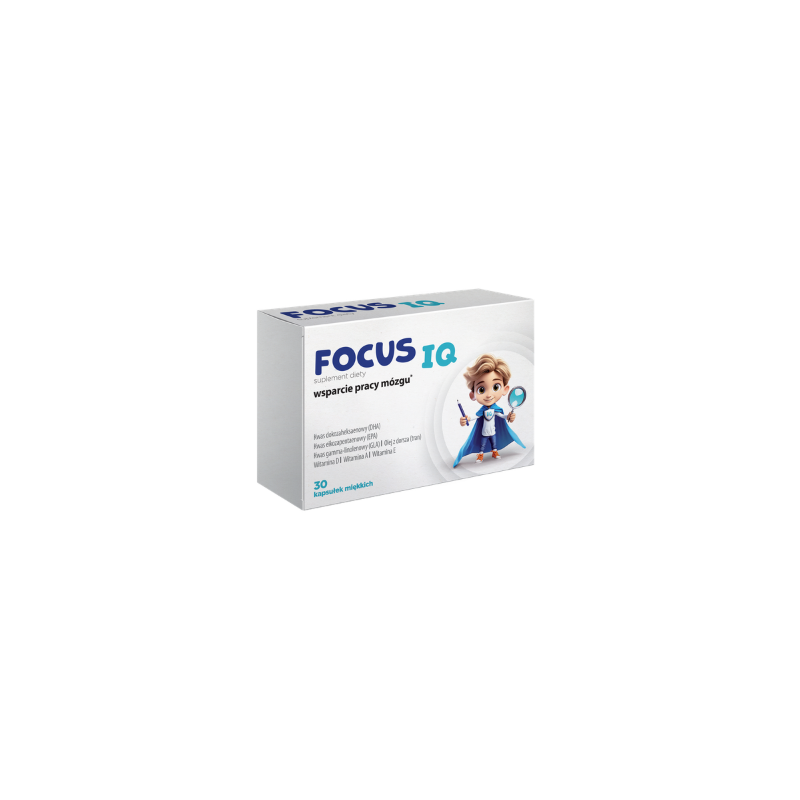 Suplement diety FocusIQ zawiera specjalnie dobraną kompozycję składników: kwasy omega-3 (DHA, EPA), tran, witaminy A, D, E oraz olej z wiesiołka. Kwas dokozaheksaenowy (DHA) przyczynia się do utrzymania prawidłowego funkcjonowania mózgu*. Witamina D pomaga w prawidłowym funkcjonowaniu układu odpornościowego, witamina A pomaga w utrzymaniu prawidłowego widzenia, zaś witamina E pomaga w ochronie komórek przed stresem oksydacyjnym. Olej z wiesiołka (źródło GLA) dostarcza wielonienasyconych kwasów tłuszczowych istotnych dla wsparcia naturalnej odporności.
