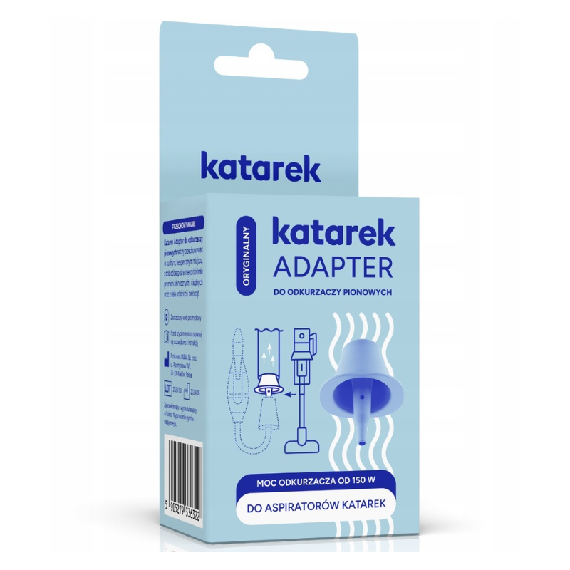 ZASTOSOWANIE: Wyrób medyczny – adapter wielokrotnego użytku do podłączania aspiratorów marki Katarek do odkurzaczy pionowych. Umożliwia połączenie z aspiratorami: Katarek Complete Secure+, Katarek Travel, Katarek Plus, Katarek Standard, Katarek Simple. Przystosowany do większości nowoczesnych odkurzaczy bezprzewodowych; wykonany z elastycznych materiałów dopasowujących się do różnych kształtów wlotu (okrągłych i nieregularnych). Pasuje do odkurzaczy z otworem 28–41 mm; najlepiej współpracuje z modelami o mocy ≥150 W (możliwa poprawna praca także z mniejszą mocą). Prosty w obsłudze i łatwy w czyszczeniu. Wskazówki/ograniczenia: nie gwarantuje poprawnego działania z odkurzaczami Samsung, Vax oraz serią Slim Dyson; nie używać z odkurzaczami przemysłowymi ani centralnymi. Przed użyciem upewnić się, że odkurzacz jest naładowany, pojemnik pusty, a boczne otwory adaptera nie są zasłonięte. Zaczynać od najniższej mocy, w razie potrzeby zwiększać; przetestować moc na delikatnym obszarze skóry; nie odsysać dłużej niż 5 s. Nie zakrywać otworów bocznych, nie stosować nadmiernej siły przy montażu, używać wyłącznie zgodnie z przeznaczeniem. Urządzenie nie jest zabawką – stosują wyłącznie dorośli po zapoznaniu się z instrukcją. Nie używać, jeśli elementy są uszkodzone/niekompletne. Nie moczyć w roztworach dezynfekujących; nie stosować żrących detergentów, chemikaliów ani materiałów ściernych. Chronić przed słońcem i skrajnymi temperaturami (powyżej +40°C i poniżej 5°C). W razie nasilenia objawów (np. kataru) skonsultować się z pracownikiem ochrony zdrowia.