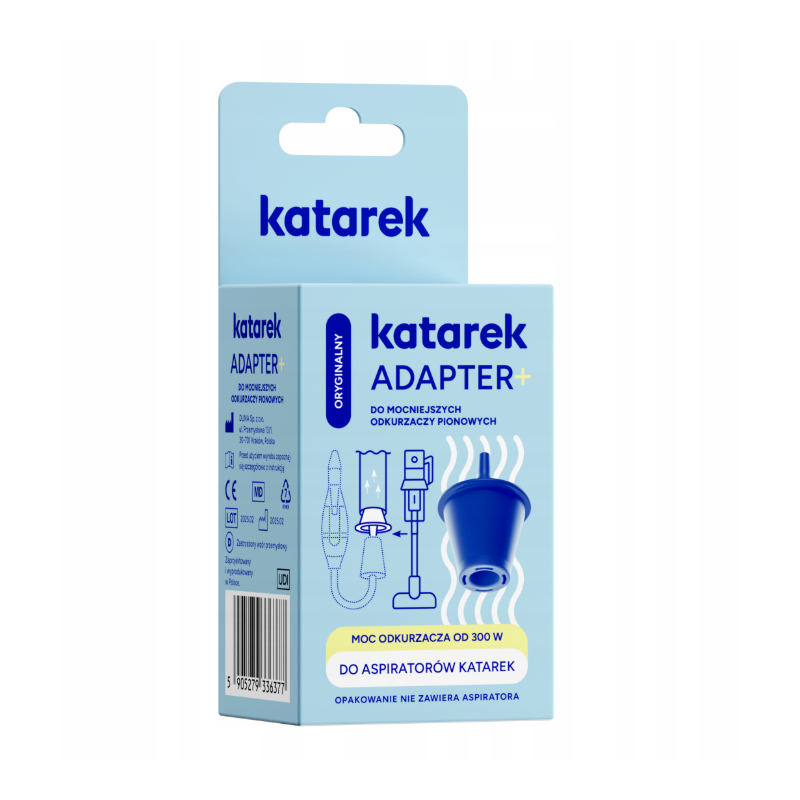 Wyposażenie wyrobu medycznego do łatwego podłączania aspiratorów Katarek do większości odkurzaczy pionowych. Rekomendowany do odkurzaczy o mocy od 300 W (działa również z tradycyjnymi odkurzaczami workowymi). Elastyczny materiał i konstrukcja z dodatkowymi otworami zapewniają właściwy dopływ powietrza przy mocnych odkurzaczach; dopasowuje się do otworów o średnicy 28–41 mm. Uniwersalny – współpracuje ze wszystkimi modelami aspiratorów Katarek. Higieniczny – łatwy do czyszczenia łagodnym detergentem i wodą. Przechowywać w suchym, bezpiecznym miejscu, z dala od słońca, dzieci i zwierząt. Ostrzeżenia/przeciwwskazania: nie używać z odkurzaczami przemysłowymi ani centralnymi; nie stosować do innych celów; nie używać uszkodzonego; nie moczyć w środkach dezynfekujących, nie używać żrących/ściernych środków; nie wystawiać na temp. >40°C lub <5°C; produkt nie jest zabawką; w razie nasilenia objawów skonsultować się z pracownikiem służby zdrowia.