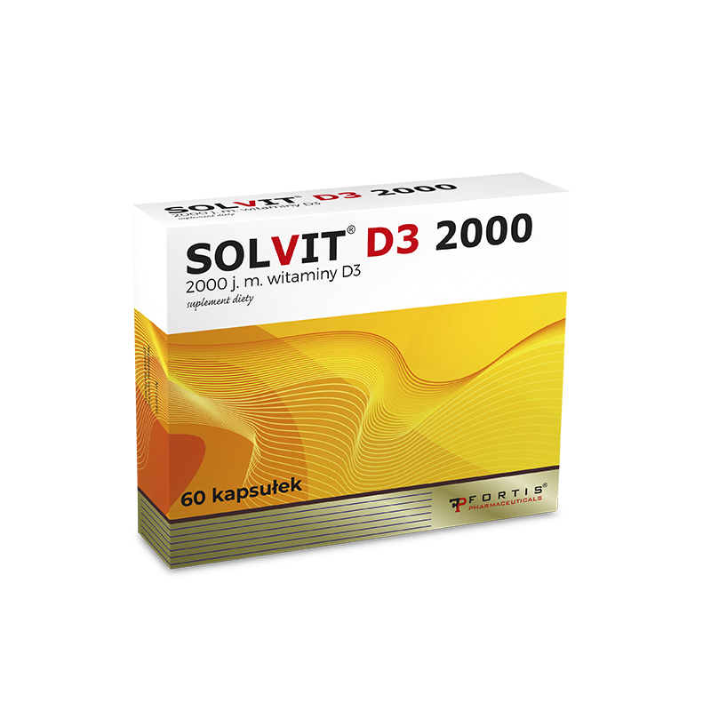 Suplement diety Solvit D3 2000 zawierający 2000 j.m. witaminy D przeznaczony jest dla osób dorosłych. Preparat przyczynia się do prawidłowego wykorzystywania wapnia i fosforu, utrzymuje prawidłowy poziom wapnia we krwi oraz przyczynia się do prawidłowego funkcjonowania układu odpornościowego i kostnego.