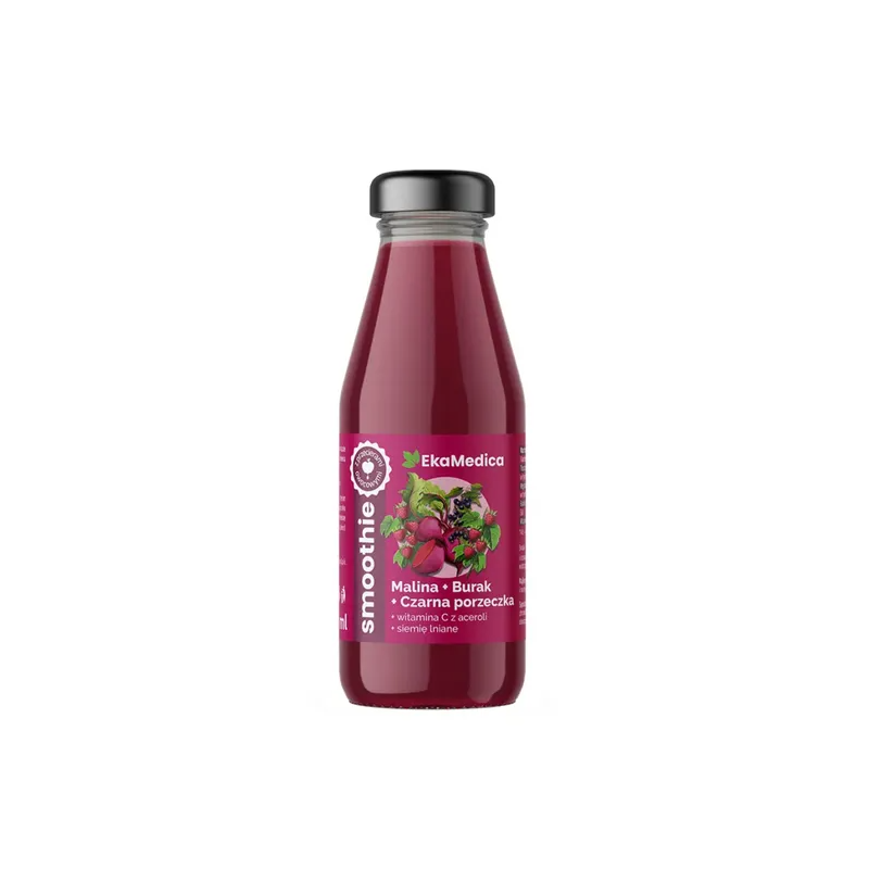 EkaMedica, Smoothie Malina Burak Czarna Porzeczka – wyjątkowe połączenie owoców i warzyw, które zachwyca bogatym, głębokim smakiem. Intensywna malina, słodko-ziemisty burak i charakterystyczna czarna porzeczka tworzą harmonijną, wyrazistą kompozycję. Napój powstaje na bazie soków NFC i przecierów, dzięki czemu zachowuje autentyczny smak składników. Zawiera siemię lniane oraz dodatek witaminy C z ekstraktu z owoców aceroli. Smoothie nie zawiera dodatku cukru – zawiera jedynie cukry naturalnie występujące w owocach. Dzięki wygodnej butelce to idealny wybór na drugie śniadanie, regenerację po treningu lub zdrową przekąskę w ciągu dnia.