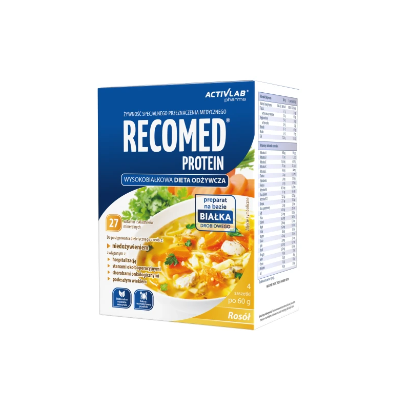 RECOMED® Protein Rosół jest produktem wysokobiałkowym o składzie uwzgledniającym zapotrzebowanie organizmu do odżywiania osób w okresie rekonwalescencji po chorobie, operacji, niedożywionych w podeszłym wieku. Zawiera wszystkie niezbędne składniki odżywcze: białko, węglowodany, tłuszcze, błonnik, a także zestaw witamin i składników mineralnych. Produkt został również wzbogacony o kolagen wołowy. Białko obecne w produkcie to najwyższej jakości hipoalergiczny hydrolizat białka drobiowego, a także mięso z fileta z kury. Skoncentrowana forma ułatwia podawanie i nie obciąża przewodu pokarmowego pacjenta.
