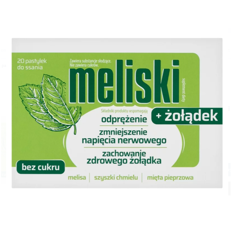 Meliski + żołądek - to suplement diety w formie pastylek do ssania, który w swoim składzie zawiera wyciągi z melisy, szyszek chmielu i mięty pieprzowej.