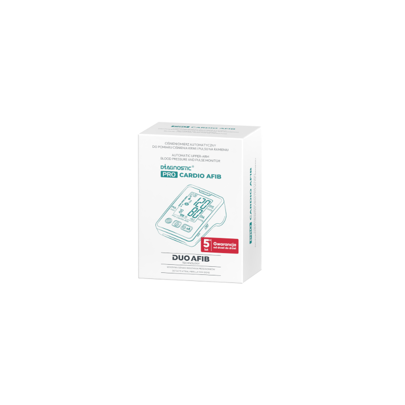 Ciśnieniomierz Diagnostic PRO Cardio Afib to w pełni automatyczne cyfrowe urządzenie do pomiaru ciśnienia krwi na ramieniu, umożliwiające wykonanie pomiarów ciśnienia skurczowego i rozkurczowego, a także tętna przy pomocy metody oscylometrycznej. Do samodzielnego wykonywania w warunkach domowych. W celu uzyskania większej ilości informacji odnośnie ciśnienia krwi i jego pomiaru skontaktuj się ze swoim lekarzem. Nie stosować urządzenia do pomiaru ciśnienia krwi u niemowląt oraz dzieci poniżej 12 roku życia, pacjentek w ciąży w stanie przedrzucawkowym. Ciśnieniomierz objęty jest 5 letnią gwarancją, mankiet 2 letnią oraz gwarancją door to door.