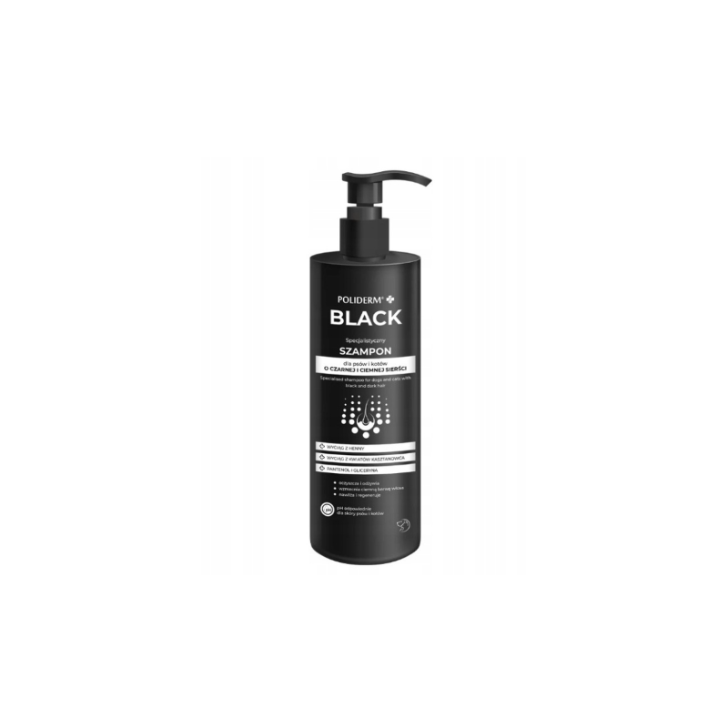 POLIDERM BLACK 250 ml – szampon do czarnej i ciemnej sierści dla psów i kotów. Specjalistyczny szampon do codziennej pielęgnacji czarnej i ciemnej sierści.