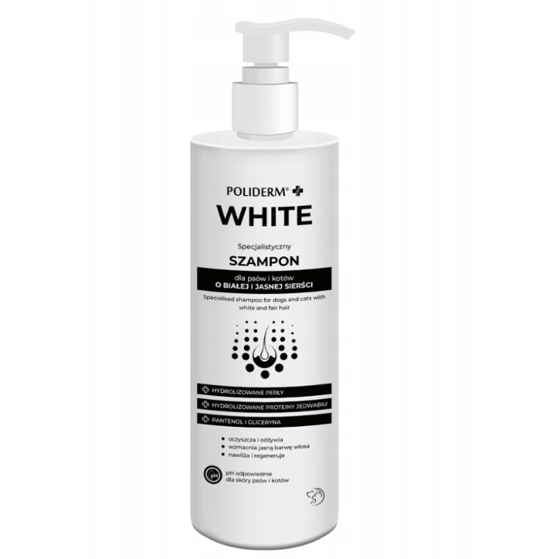 POLIDERM WHITE 250 ml – szampon do białej i jasnej sierści dla psów i kotów. Specjalistyczny szampon do codziennej pielęgnacji białej i jasnej sierści psów i kotów.