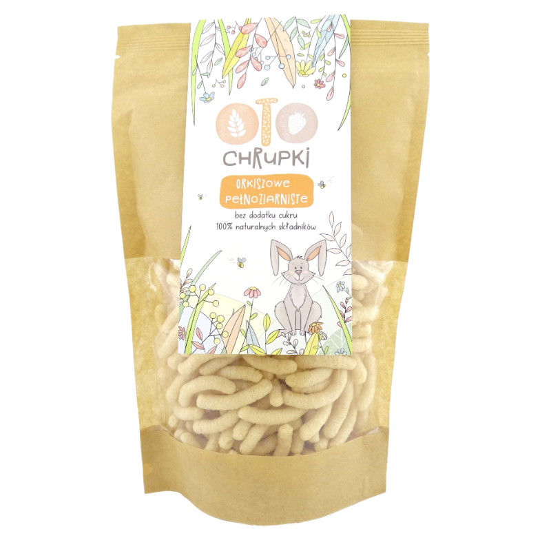 Ekologiczne, pełnoziarniste chrupki w formie chrupiących i lekkich pałeczek orkiszowych. Zawierają one w swoim składzie wysokiej jakości pełne ziarno orkiszu oraz ryż z upraw ekologicznych, stanowiąc bogate źródło białka, błonnika oraz niezbędnych minerałów. OTO Chrupki orkiszowe to produkt o krótkim i czystym składzie, bez dodatku cukru i oleju palmowego, subtelnie słodzony naturalnym ekstraktem ze stewii.