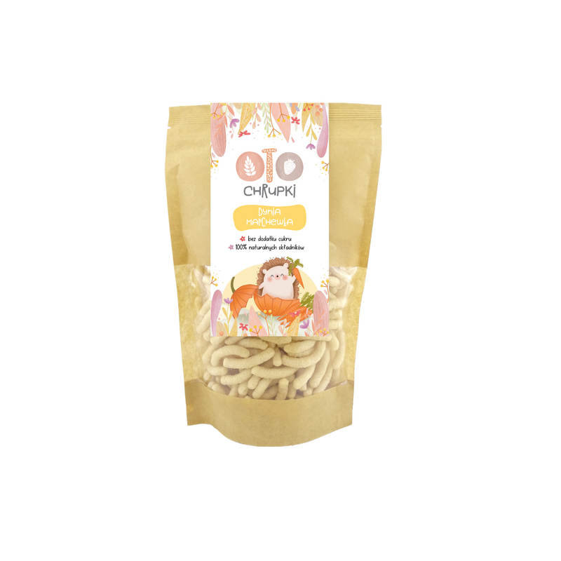Wielozbożowe chrupki w formie chrupiących pałeczek o smaku dyni i marchewki. Zawierają one w swoim składzie wartościową mąkę orkiszową i ryżową, wzbogaconą o mąkę chia oraz naturalne warzywa, które są cennym źródłem beta-karotenu, błonnika oraz witamin A, C i E. OTO Chrupki dynia-marchewka to produkt o czystym składzie, bez dodatku cukru i sztucznych substancji, subtelnie słodzony naturalnym ekstraktem ze stewii. Formuła wspiera odporność i dostarcza niezbędnych minerałów, takich jak cynk, potas i magnez.
