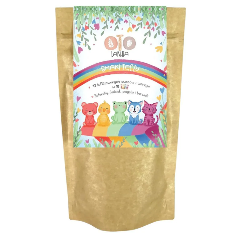 Naturalnie owocowy zestaw w formie 10 saszetek z liofilizowanym pyłkiem, zawierający kompozycję aż 13 rodzajów owoców. Dzięki procesowi liofilizacji produkt zachowuje pełnię wartości odżywczych, witamin oraz naturalny, intensywny kolor świeżych owoców. OTO Smaki Tęczy to produkt w 100% naturalny, bez dodatku cukru, barwników i konserwantów, który pozwala w kreatywny sposób wzbogacić posiłki i nadać im wyjątkowy charakter.