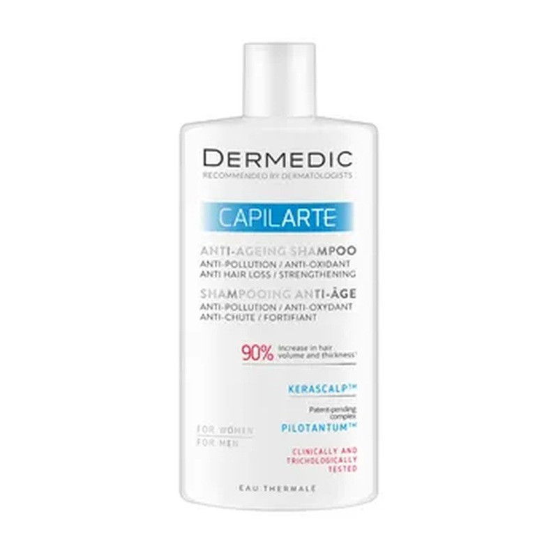 W Aptece Puls dostępny jest Dermedic Capilarte anti-ageing – dermokosmetyk przeznaczony do pielęgnacji włosów i skóry głowy z objawami starzenia. Preparat zapobiega starzeniu się włosów, ich wypadaniu i siwieniu, a pasma stają się grubsze oraz wzmocnione. Formuła została dedykowana do wrażliwej skóry głowy; produkt jest hypoalergiczny oraz przebadany trychologicznie i klinicznie. Dermedic Capilarte możesz wygodnie znaleźć online w Aptece Puls, gdzie kompletujesz codzienną pielęgnację w jednym miejscu. Składniki aktywne: Woda termalna, Kompleks PilotantumTM, ProcapilTM, KerascalpTM, Kofeina, Ekstrakt z komórek macierzystych jabłka, Ekstrakt z bazylii, Ekstrakt z owoców amli.