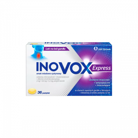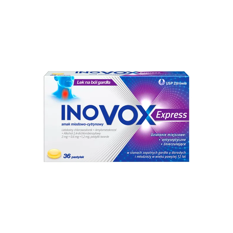Inovox Express smak miodowo-cytrynowy zawiera antyseptyki amylometakrezol i alkohol 2,4-diobenzylowy oraz środek miejscowo znieczulający do gardła - lidokainy owodorek. Lek wskazany do stosowania w celu miejscowego łagodzenia. Jeśli po upływie 2 dni nie nastąpiła poprawa lub pacjent czuje się gorzej, należy zwrócić się do lekarza.